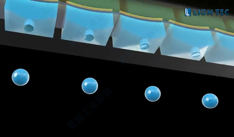 微壓電打印頭的關(guān)鍵部件是壓電元件,通常是壓電陶瓷,它能因?yàn)殡娏鞯淖兓a(chǎn)生相對(duì)應(yīng)的形變。微壓電打印頭正是利用了這一原理。在壓電式噴墨打印頭微型墨水儲(chǔ)存器后面采用了一塊壓電晶體,當(dāng)對(duì)壓電晶體施加電流時(shí),會(huì)使其向內(nèi)彈壓,當(dāng)電流中斷時(shí),壓電晶體又會(huì)反彈回到原來的位置,同時(shí)會(huì)將一滴微量的墨水通過噴嘴噴射出去,當(dāng)電流再次恢復(fù)時(shí),晶體又向外延伸,這樣就進(jìn)入了噴射下一滴墨水的準(zhǔn)備狀態(tài)。由于微壓電技術(shù)的每一個(gè)噴頭墨倉都有一塊這樣的壓電晶體,以此控制墨水的噴出,并且由于加的電壓的大小直接導(dǎo)致了形變的多少,因此噴頭噴出來的墨滴大小能夠通過電流輸出的曲線而精準(zhǔn)控制,壓電噴墨打印技術(shù)對(duì)墨滴的控制能力強(qiáng),而且墨的的形狀更加規(guī)則,定位更加準(zhǔn),打印分辨率高,更容易實(shí)現(xiàn)高精度的打印。UV噴碼機(jī)核心噴頭部件正是利用了這一先/進(jìn)的工作原理,得以實(shí)現(xiàn)高精度、高解析的噴印效果。