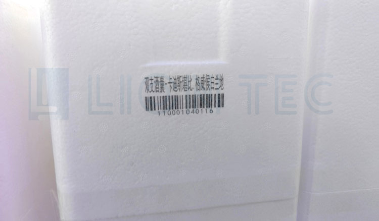 紅酒玻璃瓶由于其易碎性,在運(yùn)輸過程中需要裝箱在泡沫箱內(nèi),能有效防止酒瓶直接相互碰撞。傳統(tǒng)泡沫紙箱外包裝一般都采用貼標(biāo)簽的方式進(jìn)行產(chǎn)品追溯管理,但標(biāo)簽方式易脫落,且成本也不低。隨著壓電式UV噴碼機(jī)的興起,在泡沫箱上也可以實(shí)現(xiàn)無接觸在線噴碼,其高附著,耐摩擦,噴印清晰,成本低等優(yōu)點(diǎn),是替代標(biāo)簽的經(jīng)濟(jì)性與環(huán)保性的理想選擇。