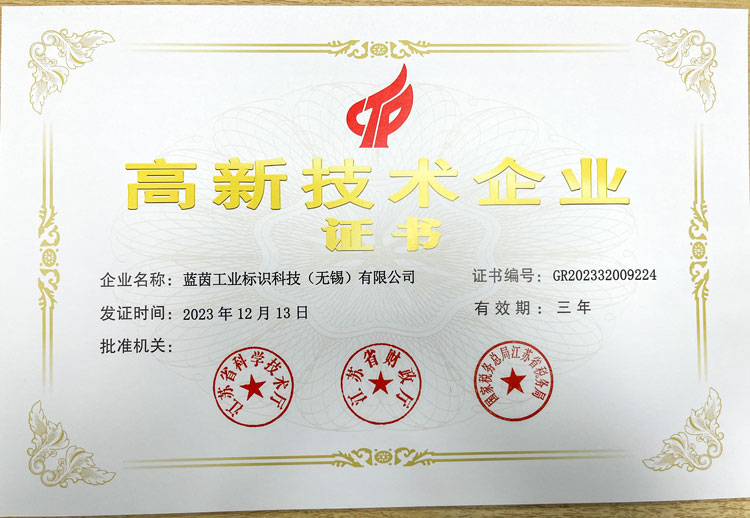 近日,藍(lán)茵工業(yè)標(biāo)識科技(無錫)有限公司喜獲國家級“高新技術(shù)企業(yè)證書”,成為國家高新技術(shù)企業(yè),并頒發(fā)了證書。此次藍(lán)茵LIONTEC取得的《高新技術(shù)企業(yè)證書》,發(fā)證審批機(jī)關(guān)分別為江蘇省科學(xué)技術(shù)廳、江蘇省財政廳、國家稅務(wù)總局江蘇省稅務(wù)局。證書的頒發(fā)充分說明了國家相關(guān)部門對藍(lán)茵