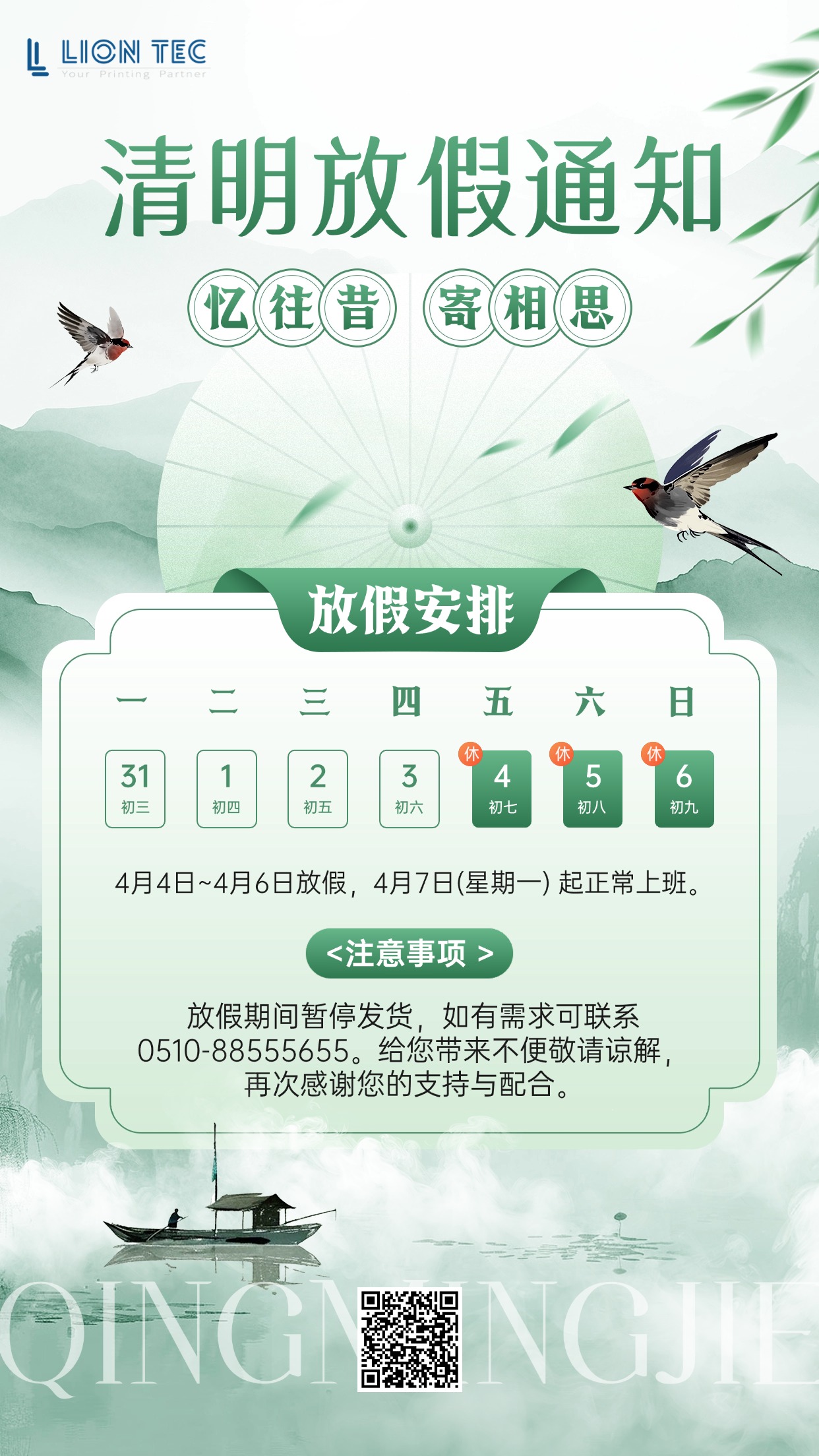 人間四月芳菲盡,春風(fēng)落日寄哀思。清明,是慎終追遠(yuǎn)的時節(jié),是對親人的思念,更是文化的傳承。清明節(jié)即將到來,根據(jù)國家法定節(jié)假日規(guī)定,噴碼機(jī)廠家藍(lán)茵現(xiàn)將 2025 年清明節(jié)放假安排通知如下: