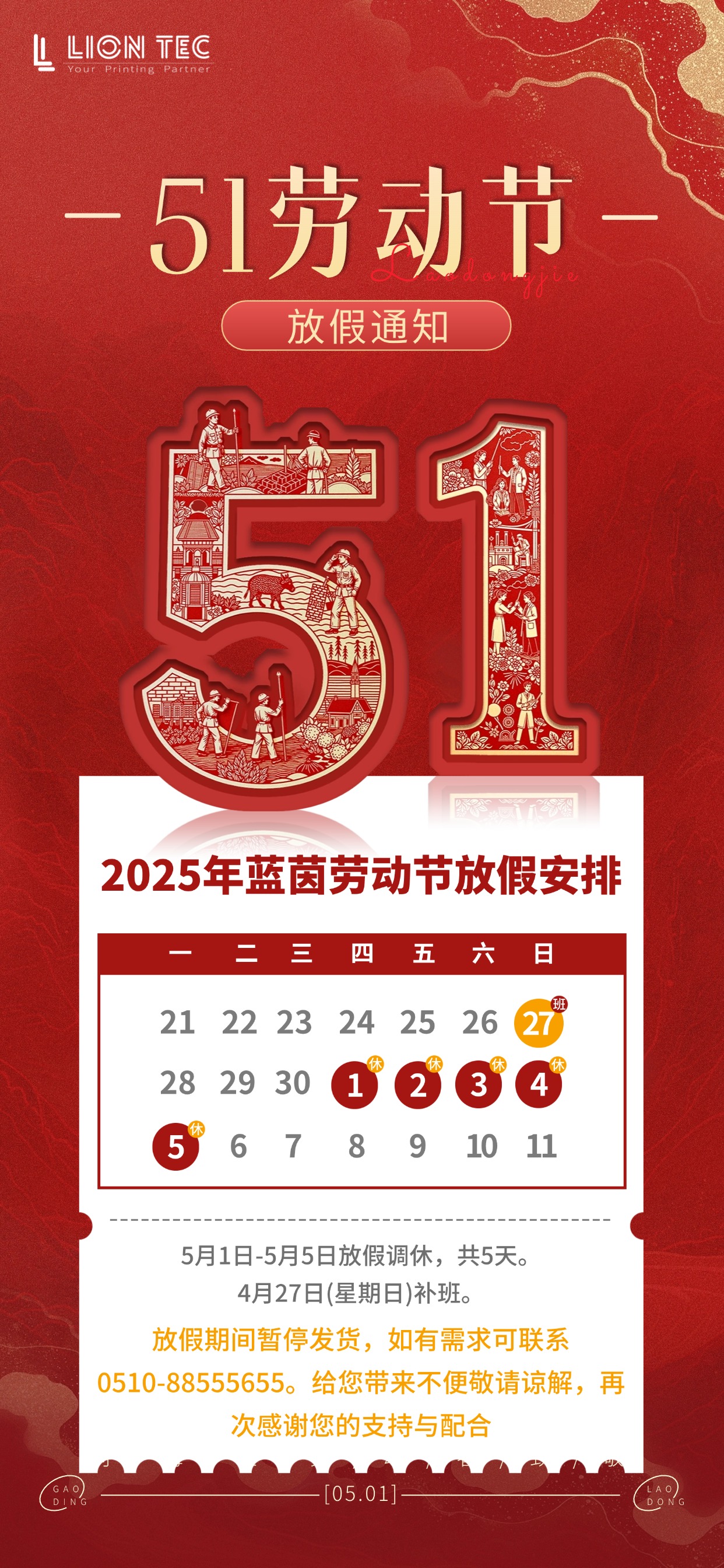 四月芳菲盡,五月絮升華追夢山海間,追光星辰里五一·勞動節(jié)即將到來,根據(jù)國家法定節(jié)假日規(guī)定,噴碼機(jī)廠家-藍(lán)茵現(xiàn)將2024年勞動節(jié)放假安排通知如下: