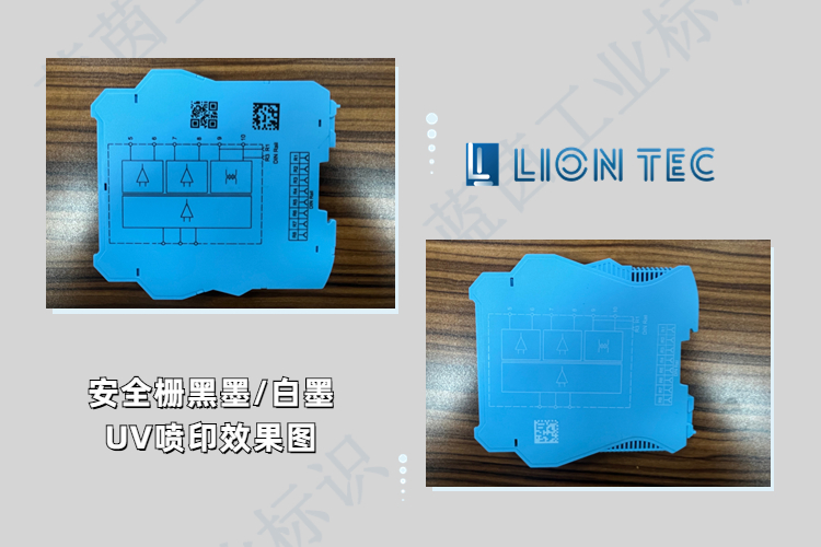 客戶在藍茵通過UV噴碼機打樣的安全柵產(chǎn)品的效果圖。噴印內(nèi)容包括線路圖標識、二維碼,一面打黑墨,一面打白墨。